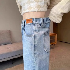 水洗棉复古做旧松紧高腰牛仔裤女春季新款百搭显瘦阔腿休闲弯刀裤