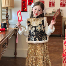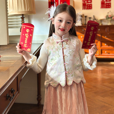 栀了成长记女童装新中式唐装拜年服2025冬季儿童加厚保暖马甲套装