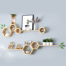 实木无漆六边形免打孔墙上置物架创意格子电视背景墙装饰架 隔板