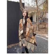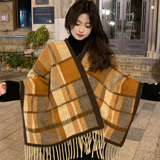 美拉德系格子披肩女外搭韩版百搭秋冬季仿羊绒保暖围巾斗篷厚披风