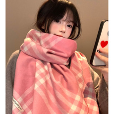 粉色锁边格子围巾女秋冬韩系高级感加厚保暖护颈围脖学生防寒披肩