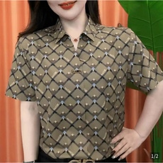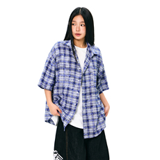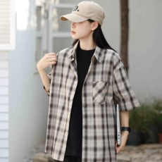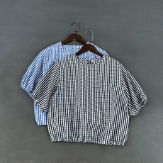 外贸女装试衣间跟单夏季简约小格子宽松短款圆领短袖衬衫衬衣上衣