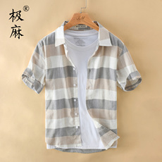 男式短袖t恤真口袋男士格子衬衫薄款棉麻爸爸装衬衣翻领开衫男