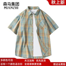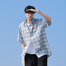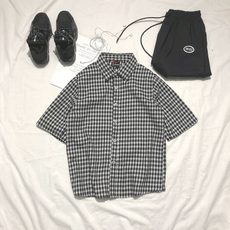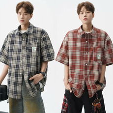 美式复古格子衬衫男女夏季基础宽松百搭情侣款cityboy短袖衬衣男
