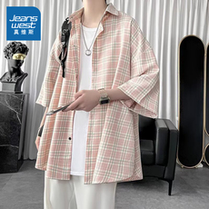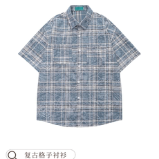 GEJONES日系复古水波纹做旧格子衬衫男女休闲港风百搭翻领短袖
