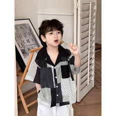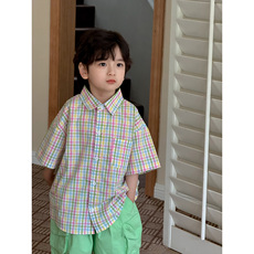 出口元旦~男童格子衬衫2025夏季新款短袖T恤中大儿童装半袖衬衣潮