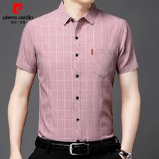 皮尔卡丹格子短袖衬衫男夏季时尚百搭寸衫高级感桑蚕丝半袖衬衣男