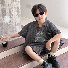 男童夏季薄款短袖格子衬衫2025新款儿童中大童小男孩时尚休闲衬衣