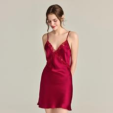 秋季新款V领玫红真丝睡衣女100%桑蚕丝性感纯欲镂空美背吊带睡裙