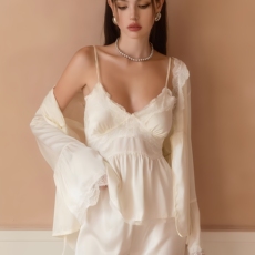 法式真丝睡衣女高级感桑蚕丝性感带胸垫蕾丝边纯欲家居服三件套