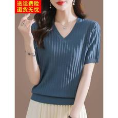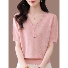 时尚简约v领冰丝短袖t恤女夏装高级感镂空针织小衫桑蚕丝体恤上衣