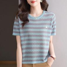 桑蚕丝短袖t恤女妈妈夏装宽松短款冰丝针织小衫薄款镂空条纹上衣