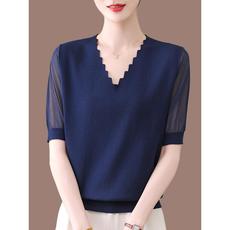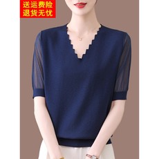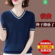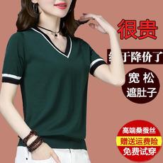 新款妈妈针织桑蚕丝T恤女V领冰丝体桖短袖真丝半袖上衣小衫夏季