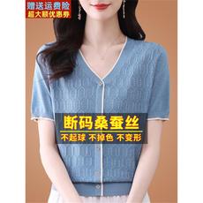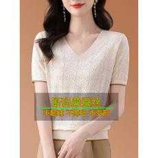 V领桑蚕丝短袖t恤女2025新款夏季时尚镂空上衣妈妈薄款冰丝针织衫