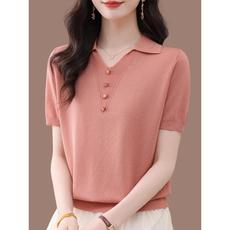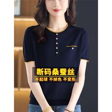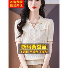 夏装新款桑蚕丝短袖T恤女翻领宽松上衣时尚减龄妈妈冰丝针织小衫