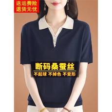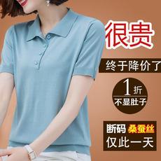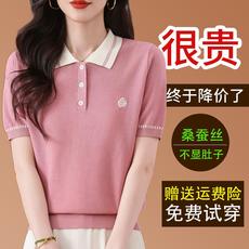 桑蚕丝短袖t恤女夏季妈妈装宽松冰丝针织小衫洋气polo领半袖上衣