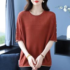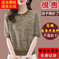 中年妈妈装短袖t恤女新款夏季圆领洋气宽松遮肚桑蚕丝针织上衣薄