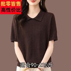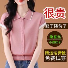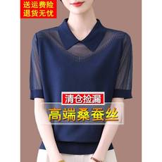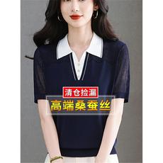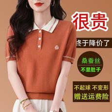 薄款桑蚕丝短袖t恤女夏季新款翻领宽松上衣妈妈洋派短款针织小衫