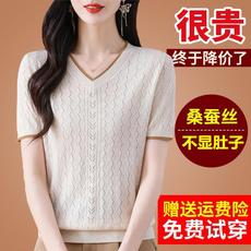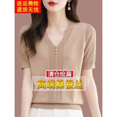 2024夏季薄款桑蚕丝短袖t恤女v领宽松冰丝针织衫真丝短款妈妈上衣