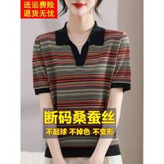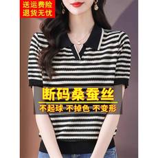 2025新款夏装桑蚕丝短袖t恤女薄妈妈冰丝小衫针织条纹带领子上衣