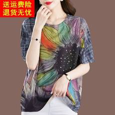 冰丝短袖T恤女夏季薄款妈妈装宽松大尺码时尚印花针织衫桑蚕丝上