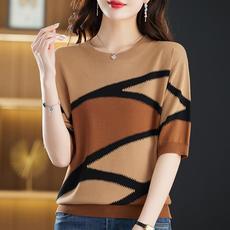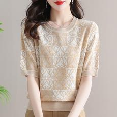 2025夏季桑蚕丝短袖t恤女针织提花洋气小衫妈妈宽松显瘦漂亮上衣