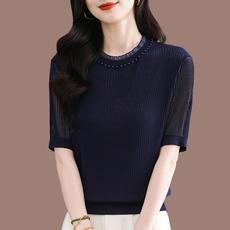 2025夏季桑蚕丝短袖t恤女士圆领针织漂亮衬衫妈妈的西式宽松修身