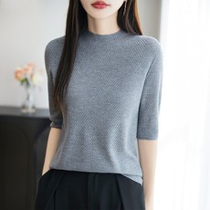 桑蚕丝半高领羊毛针织五分袖女斜纹提花短袖T恤宽松中袖打底上衣