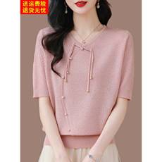 新中式国风短袖t恤女2025新款夏季桑蚕丝V领上衣妈妈洋气针织小衫