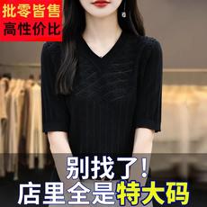 冰丝针织衫短袖t恤女夏季胖mm大码遮肚子显瘦真丝桑蚕丝v领上衣