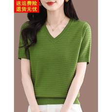 2024新款大牌桑蚕丝短袖t恤女夏v领针织体恤小衫冰丝绿色上衣短款