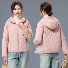 连帽减龄棉服女2025秋冬新款宽松韩版休闲菱形格棉衣纯色棉袄外套