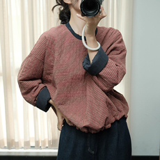 秋冬新韩版100%棉复古文艺圆领双层夹棉宽松舒适条纹套头卫衣棉服