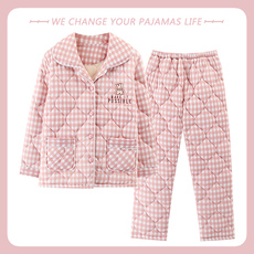 甜美冬季针织夹棉睡衣女纯棉三层夹棉袄长袖加厚保暖家居服套装