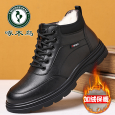 啄木鸟冬季加绒保暖男士棉鞋加厚中高帮棉皮鞋男中老年羊毛雪地靴