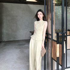 木子李的李新中式立领盘扣收腰棉麻马甲上衣垂感阔腿长裤套装女夏