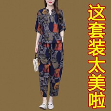 阔太太夏装冰丝棉麻休闲套装女洋气减龄中年妈妈大码哈伦裤两件套