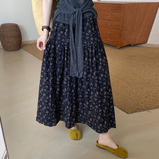 春秋夏季原创复古亚麻裙棉麻中长裙半身裙子学院风印花松紧腰半裙