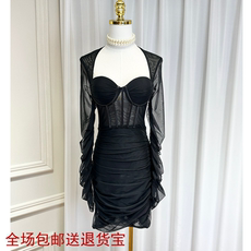 新款纯欲风辣妹软纱带胸垫鱼骨设计感收腰褶皱包臀连衣裙小礼服