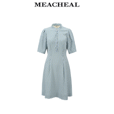 马天奴新款蓝色印花拼接翻领珍珠扣收腰短袖A字裙气质连衣裙