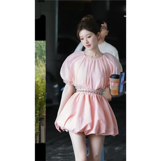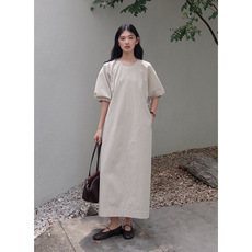 CLEAN SPACE经典泡泡袖连衣裙2025十三行新韩系圆领梭织长裙