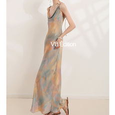 亚麻渐变色长款连衣裙夏季新款女仙气飘飘复古文艺宽松吊带两件套