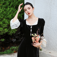 JUJU定制高级感千金风法式宫廷蕾丝撞色丝绒连衣裙女黑色长裙秋季