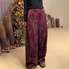 高端复古印花粉红色棉麻阔腿裤女2025秋季新款定制小众宽松休闲裤