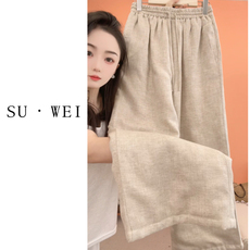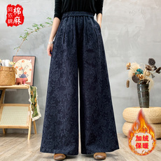 新中式国风棉麻提花加棉保暖休闲阔腿长裤女复古百搭流苏直筒裤子