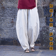 草民麻衣冬季加绒保暖休闲裤男棉麻厚款宽松直筒复古松紧苎麻裤子