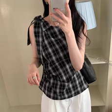 小菲家~2025夏新款棉麻大码格子背心裙胸前拼接木耳边无袖连衣裙