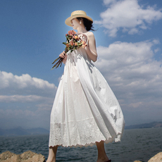 【惬意旅行】白色吊带连衣裙女2025夏季新款纯棉无袖刺绣拼接长裙