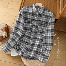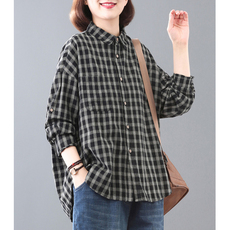外贸出口女装复古格子衬衫女棉麻长袖衬衣宽松休闲上衣翻领打底衫