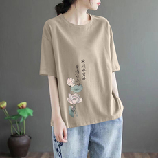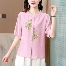 中老年女式民族风秋季新款棉麻上衣妈妈装复古减龄60岁绣花T恤衫